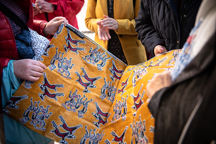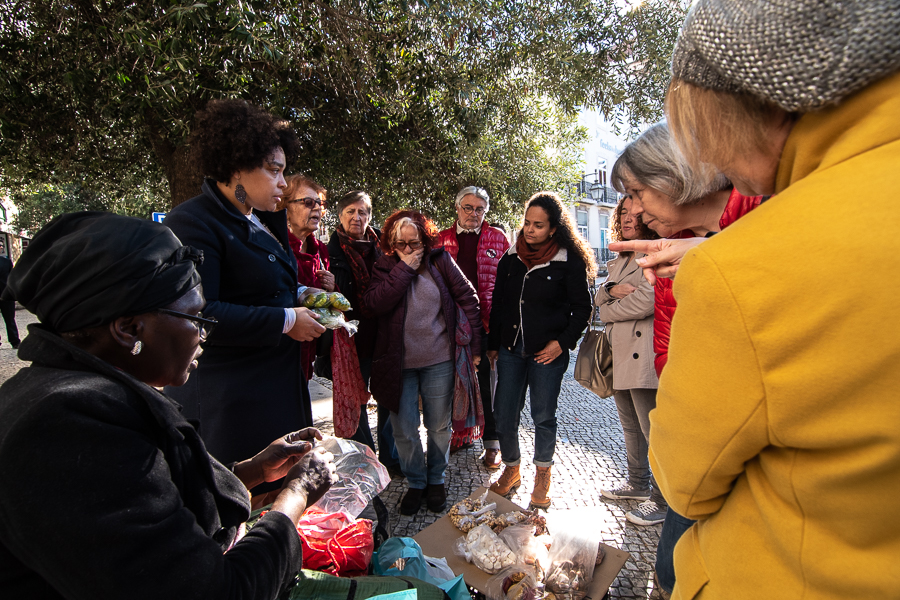 Chegámos aos poucos. “Não me inscrevi… posso participar?”, indaga Isabel. Pouco a pouco, apresentamo-nos. “Sou francês, mas moro em Portugal há três anos”, partilha Jim. “Gosto das diversas formas de vida, de cultura, de pessoas que encontro em Lisboa”, acrescenta Anny, também francesa. O grupo que se forma é oriundo de Portugal – do Algarve a Trás-os Montes – do Brasil, de Cabo Verde e de França, mas, se olharmos atentamente, percebemos que é dali mesmo. Um sítio onde todos cabemos e encontramos elementos que integram a nossa vivência. Seja a Guiné-Bissau dos frutos que Cadi nos dá a provar num dos bancos de pedra do Largo – como a cabaceira da qual se faz um sumo delicioso – seja a simbologia de uma capulana (tecido de pano) trazida de uma viagem a Moçambique ou numa vitrine, que adoramos vestir ou pôr à mesa numa refeição em família. E agora, encontrados esses elementos, a aventura de percebê-los: “No Brasil estuda-se a História europeia mas pouco aquela africana… aqui estou a ter oportunidade de aprofundar mais as minhas origens”, partilha Hérica Nogueira, uma das guias da nossa rota “Há Mundos na Mouraria” do Migrantour Lisboa. Mas é preciso “amarrar bem a capulana”, como se diz no Brasil perante algo desafiante.