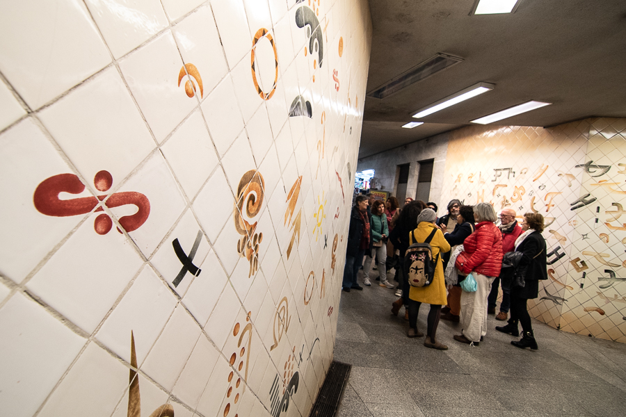 Das hortas dos mouros que se avistavam ao longo da encosta vão convergindo para a conversa as margens de um rio que outrora corria no lugar da Avenida Almirante Reis. Mas, com o tempo, o centro expande-se, as pessoas aproximam-se, as ruas transformam-se. No antigo metro do Socorro, hoje Martim Moniz, a artista angolana Gracinda Candeias – apoiando-se no azulejo introduzido pelos árabes na Península Ibérica – pôs em comunicação ao longo de quatro anos, entre formas circulares e traços verticais, elementos árabes, portugueses e angolanos. A geometria de uma cultura de diálogo em permanente mutação. Levado para o Brasil pelos portugueses, “o hábito de usar o azulejo na parte de fora das casas é entretanto trazido do Brasil para Portugal, por volta do século XVIII”, ressalta Hérica entre as suas duas terras.