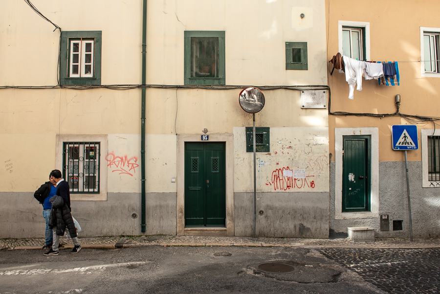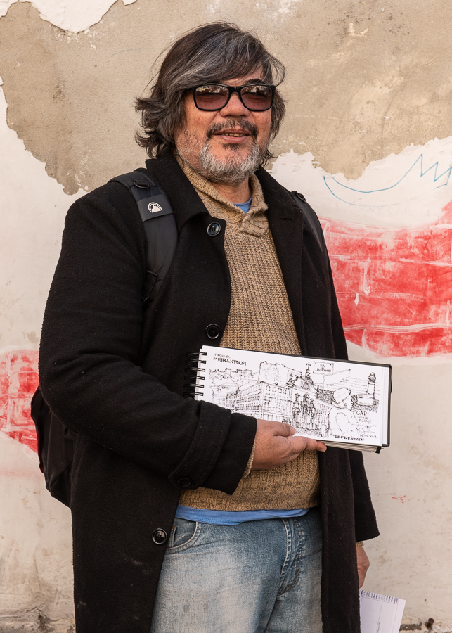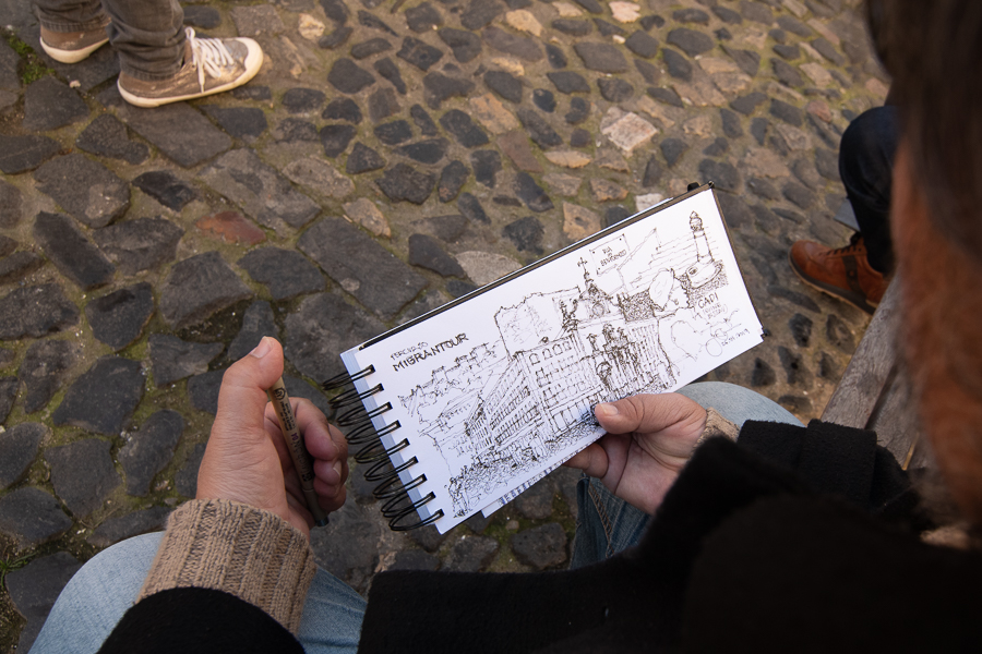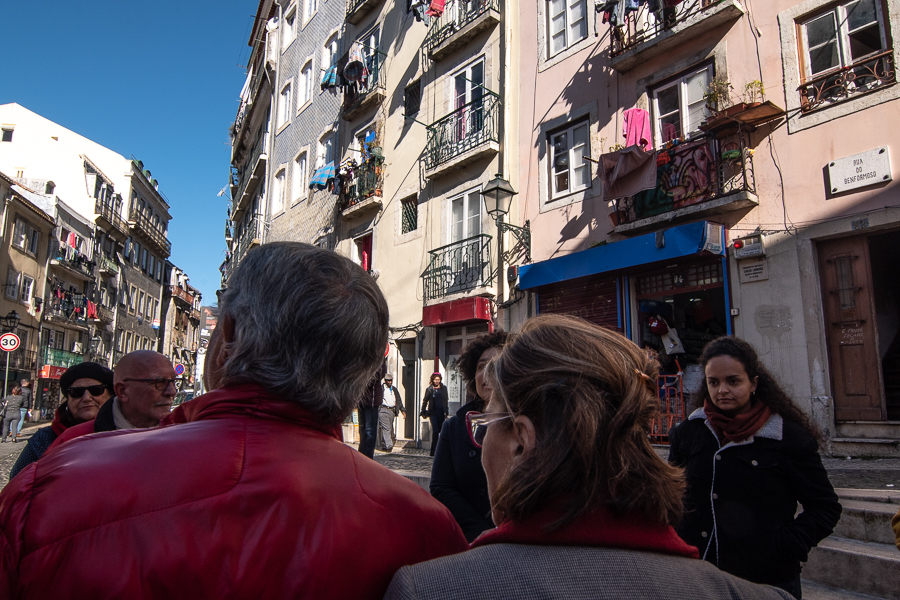 Enquanto caminhamos, “a prática vai trazendo a sensibilidade para observar as coisas”, partilha José Clewton, desenhando um pouco mais. Vemos, aos poucos, alternarem-se bonitos prédios reestruturados, mas sem a vida que antes nos chamava, de roupa pendurada à janela. É aí que se alojam hoje muitos turistas que, apesar da cultura que trazem e levam, vão moldando o bairro como lugar de passagem e de consumo rápido. Raquel questiona esta ocupação num bairro que “levou tanto tempo e tanto trabalho a construir de forma equilibrada”. “Já há limites em termos de habitação para o turismo”, mas também “um grande desafio pela frente”, responde Cátia, relembrando a luta dos moradores na Praça do Martim Moniz por espaços de lazer que não sirvam apenas fins comerciais.