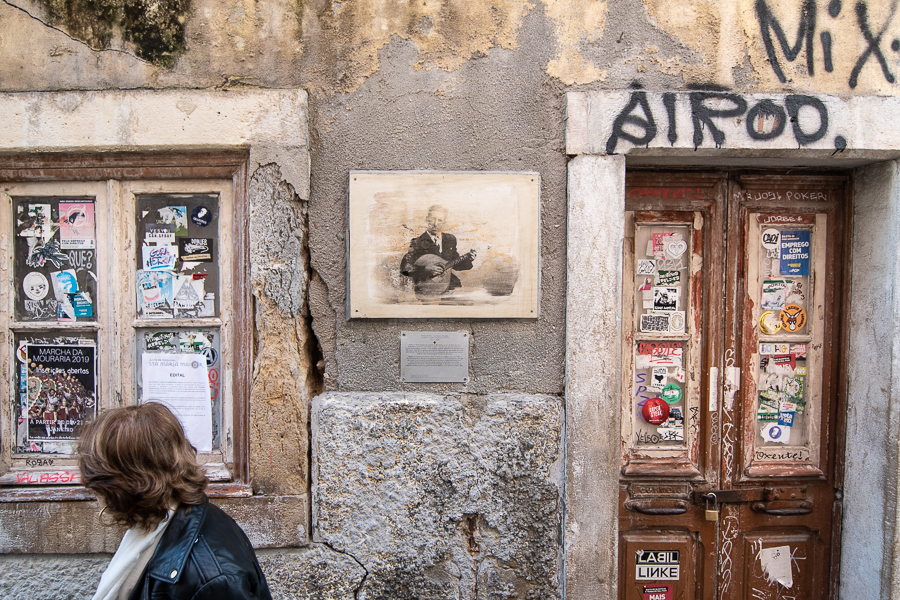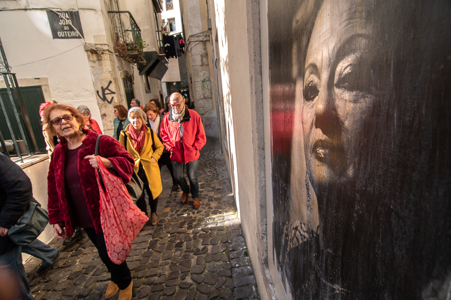 Mais adiante, ficamos a saber que o fado – de múltiplas influências nas suas composições e sonoridade – nasce e migra para zonas nobres da cidade pelas mãos de um grande aficionado das touradas, o 1º Conde de Vimioso, D. Francisco de Paula de Portugal e Castro. Quase porta a porta, moradas de grandes fadistas e, sem um retrato seu, Severa – a mãe do fado – é pintada e deixada à nossa imaginação. À frente, no Largo da Severa, Cátia cumprimenta um amigo. Apresenta-nos o projeto Enciclopédia dos Migrantes no qual, ajudando a recolher 50 cartas de moradores do bairro sobre a experiência no seu país de residência, enviadas para os seus familiares e amigos, Cátia partilhou as suas origens cabo-verdianas e “entrou mais ainda no bairro”.