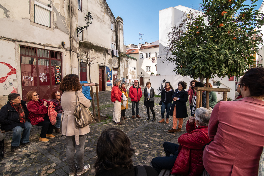 Maria Amélia veio com duas amigas, alfacinhas como ela, a residirem também hoje fora de Lisboa. “É um mundo global que está integrado neste local”, observa Maria Carolina, com experiências de trabalho (remunerado e voluntário) em África. “Este tour chamou-me a atenção para uma nova forma de ver. Às vezes a gente olha e não vê”, acrescenta Maria Aduzinda, num largo onde diz ir descobrindo sempre coisas novas. “Era o que eu estava dizendo… quando desenho, entro numa outra lógica que é a do tempo lento, observando”, diz José Clewton. “Não estava com a intenção de desenhar estes cenários do tour, mas foi surgindo”, detalha este arquiteto enquanto partilha com as três amigas a sua Lisboa, desenhada nos seus tempos de pós-graduação na cidade.