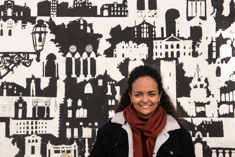 Hérica, de Brasília – capital brasileira feita por migrantes de todo o Brasil –, esclarece que só na Mouraria são hoje mais de cinquenta nacionalidades a conviver, de acordo com os censos de 2011. É nesta multiplicidade que José Clewton se demora no retrato a Cadi, proveniente de Bissau, que nos garante estar ali “todos os dias” no Largo, desde que chegou a Portugal para fazer tratamento. Vemo-la agora no papel, lado a lado com o património que a rodeia e com o qual interage, enquanto prosseguimos pela Rua do Arco da Graça. “Vivi muito tempo na Penha de França, ao pé da Graça, mas depois fui para Sintra… Conheço a rua debaixo, mas para esta aqui nunca vim”, partilha Maria Amélia, fascinada pela variedade de restaurantes e lojas que vai espreitando. Cátia Lopes – colaboradora do IMVF e
